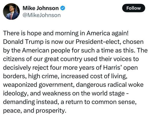 Speaker of the US House of Representatives Mike Johnson declared Donald Trump the President-elect.Donald Trump himself, who is in Florida, came out to his supporters. He came out to the song «God Bless the U.S.A.» Next to him is his family, including his wife Melania and son Barron.