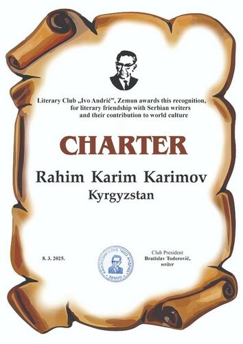 As the diploma states, the award was given to Rahim Karim «for literary friendship with Serbian writers and his contribution to world culture.»