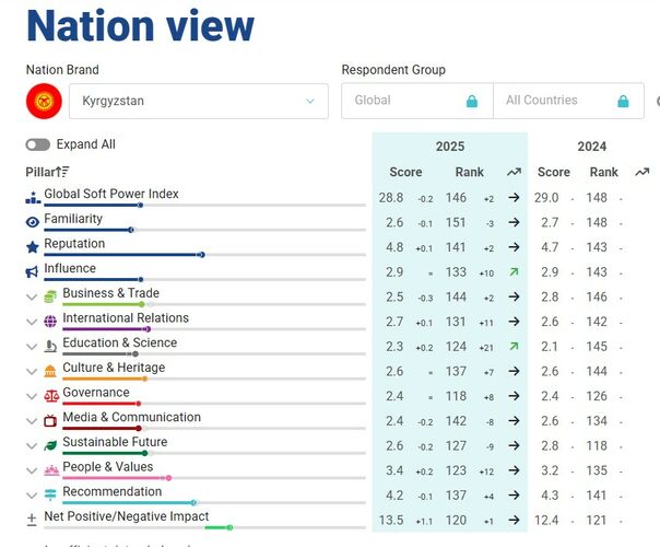 Kyrgyzstan has moved two positions up in the Global Soft Power Index 2025, ranking 146th with 28.8 points. The ranking has been compiled by the consulting organization Brand Finance for six years in a row.