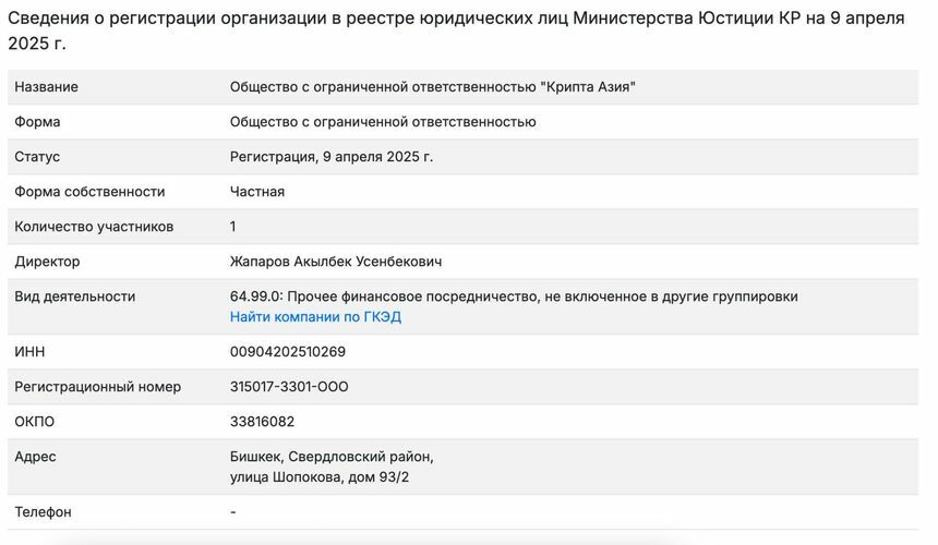 According to the register of legal entities, Akylbek Japarov registered the financial company Crypta Asia.