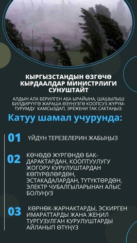 A thunderstorm and strong western wind, the speed of which will reach 17-22 meters per second, are expected in Bishkek and Chui Valley in the next three hours and throughout the day. The press service of the Ministry of Emergency Situations reported.