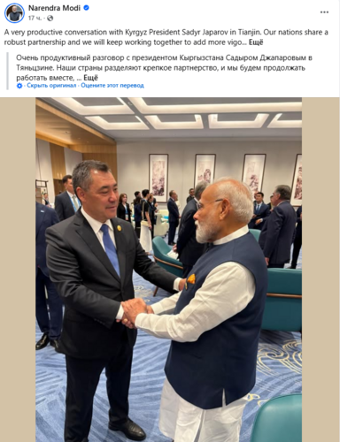 «A very productive conversation with Kyrgyz President Sadyr Japarov in Tianjin. Our nations share a robust partnership and we will keep working together to add more vigour to our developmental cooperation,» Modi wrote on his official social media account, posting a photo from the meeting.The post drew hundreds of comments from Indian users, many of whom praised the Prime Minister’s growing influence, calling him a «global leader» and even «worthy of the Nobel Peace Prize.»