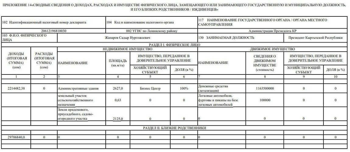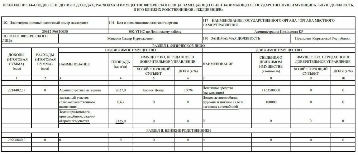 According to the report, President Sadyr Japarov earned 2,214,482.38 soms in 2024. No expenses were indicated.