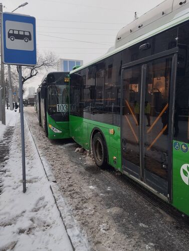 A traffic accident involving two buses occurred at the intersection of Baitik Baatyr and Mederov Streets in Bishkek. Eyewitnesses reported the road accident.