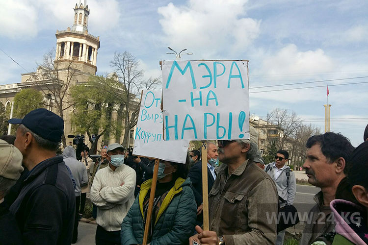Residents of Bishkek, who gathered for the flash mob «We are suffocating» in front of the building of the Bishkek City Administration, demand resignation of the mayor Albek Ibraimov. They accuse the authorities of corruption.