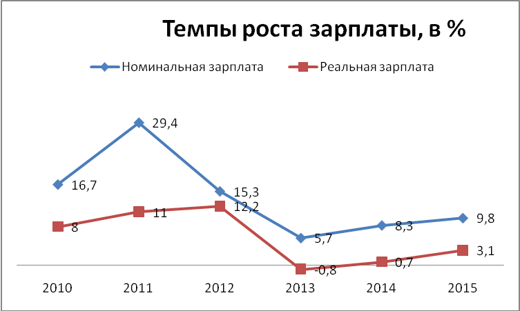 3. Номинальный и реальный темпы роста заработной платы растут неравномерно. Реальный рост заработков напрямую зависит от темпов инфляции, то есть роста цен. При этом самая большая разница в росте номинальной и реальной зарплаты отмечена в 2011 году. Тогда номинальная зарплата за год выросла на 29,4 процента, а реальная - всего на 11 процентов.