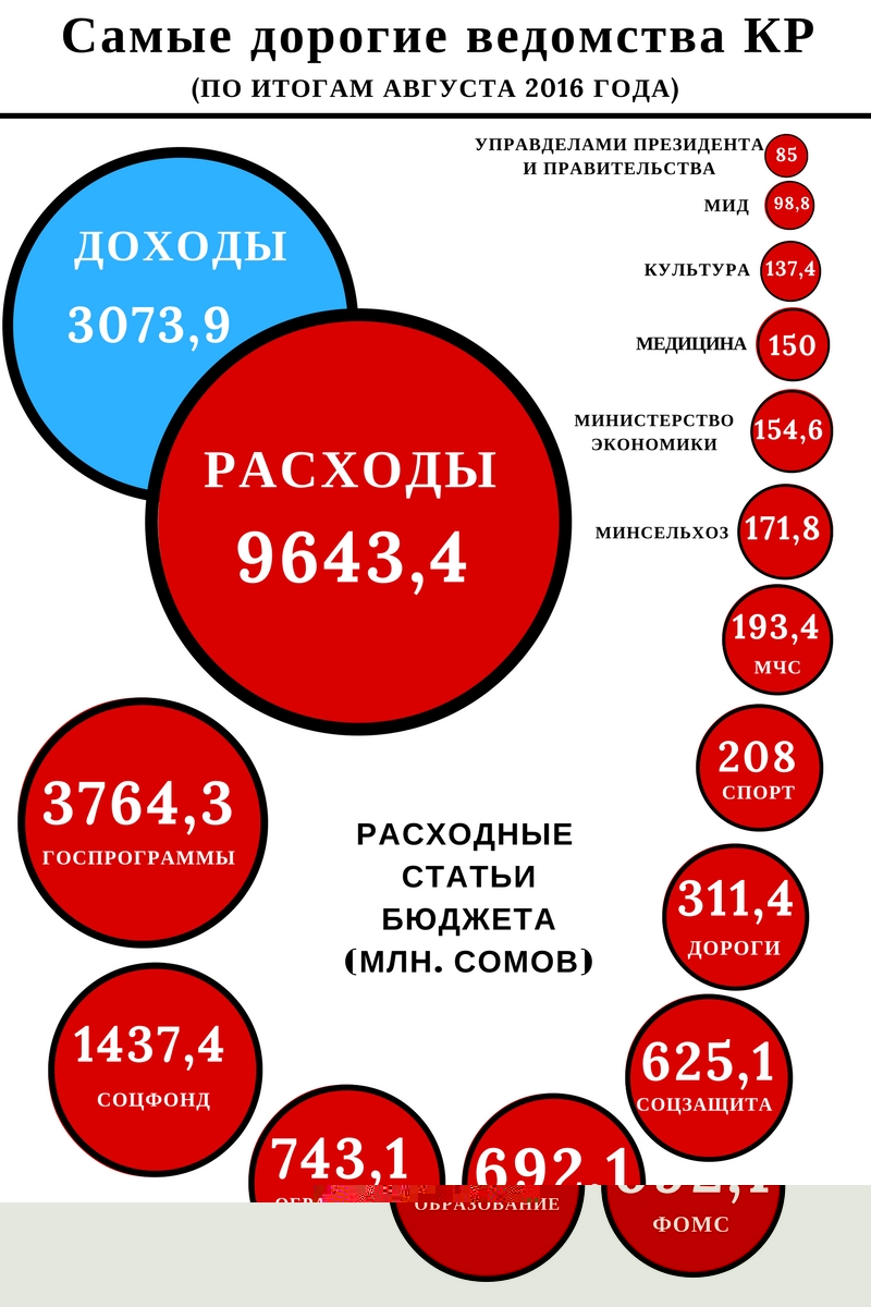 По его данным, всего расходы республиканского бюджета составили 9 миллиардов 643 миллиона 439,3 тысячи сомов. Из них на зарплату бюджетникам потратили 1 миллиард 475 миллионов 310,9 тысячи, на выплату пособий по социальному обеспечению - 1 миллиард 437 миллионов 624,4 тысячи, по социальной помощи населению – 547 миллионов 343,7 тысячи.