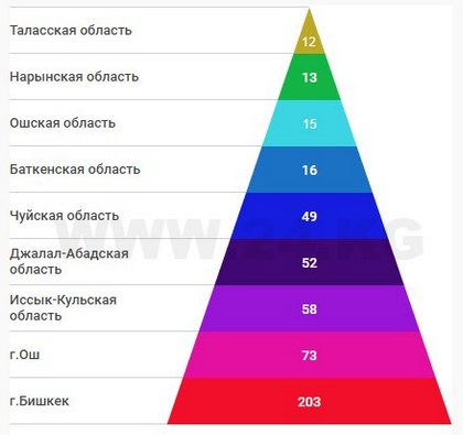 По данным на 16 ноября, выдан 491 кредит. Больше всего из них (203) - в Бишкеке, меньше всего – в Таласской области (12). В разрезе по регионам ситуация выглядит так: