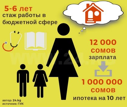 По статистике ГИК, в основном ипотеку берут женщины в возрасте 35-50 лет с двумя детьми, стажем работы в бюджетной сфере 5-6 лет. Она берет в ипотеку 1 миллион сомов на 10 лет. Ее зарплата примерно 12 тысяч сомов.