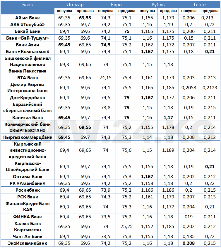 Курсы валют в коммерческих банках Кыргызстана на 24 января 2017 года: