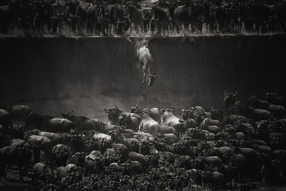 Антилопы гну форсируют реку Мара в Африке. Nicole Cambrе