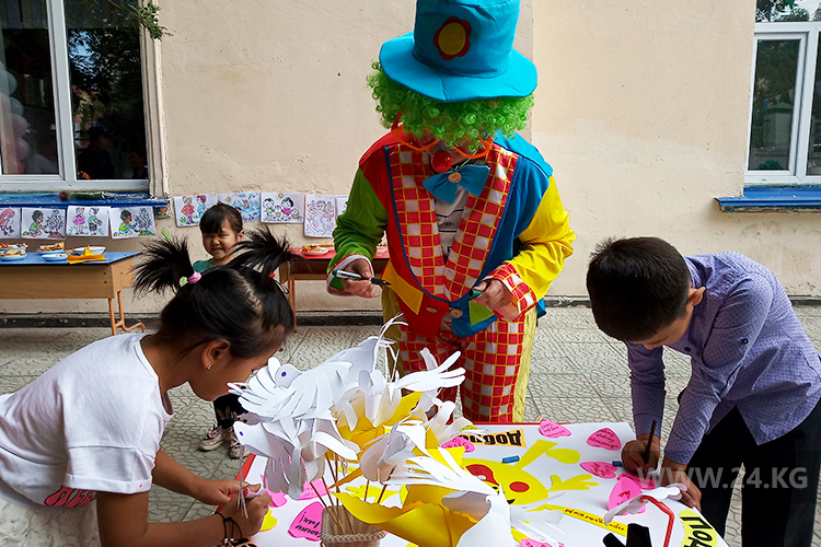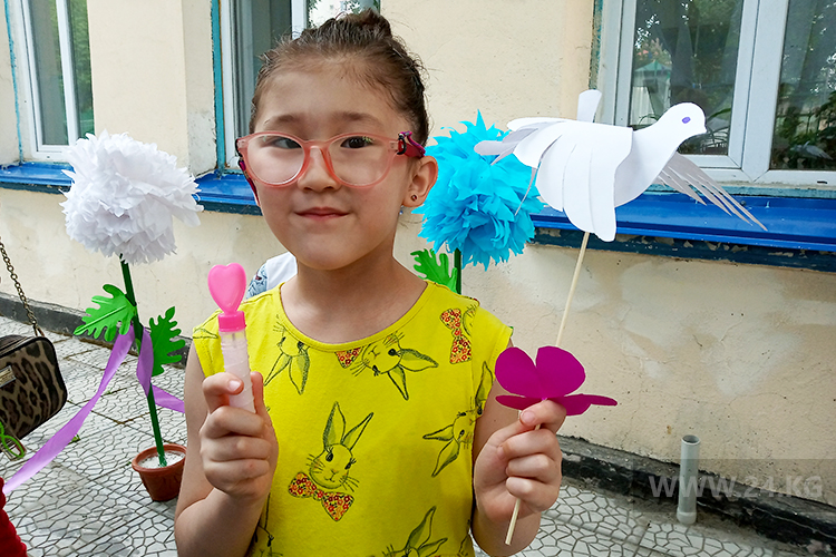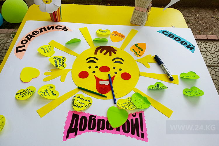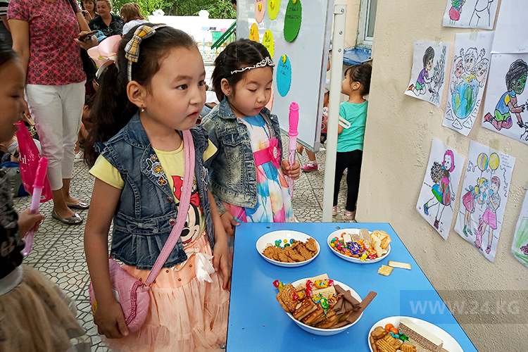 Аталган бала бакчанын жамааты балдарды таттуулар менен тосуп алышты. Бөбөктөр асфальт бетине сүрөт тартып, ата-энелер атайын дайындалган плакаттарга каалоо-тилек жазышты.