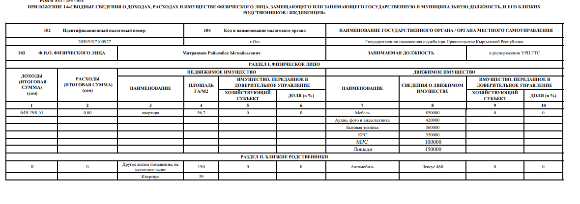 Муну менен катар анын жеке менчигинде болгону 56,7 чарчы метрлик батири, эмереги, аудио- , фото- жана турмуш-тиричиликтик техникасы (1 миллион 630 миң сомдук), 100 миң сомдук кичи мүйүздүү малы, 350 миң сомдук ири мүйүздүү малы жана 150 миң сомдук жылкылары бар экени айтылат.