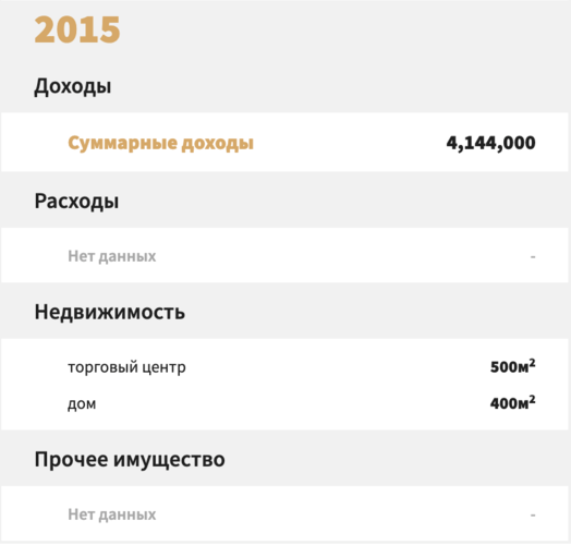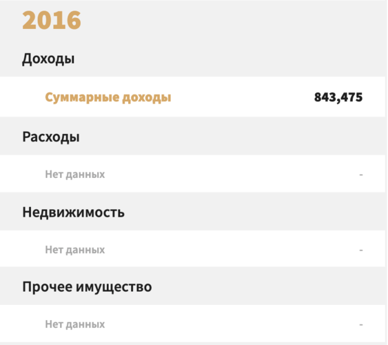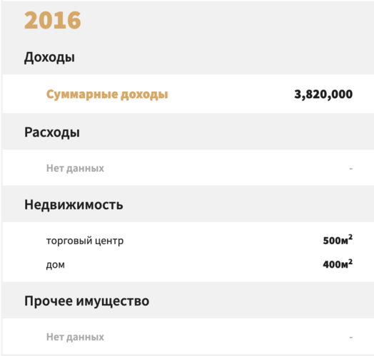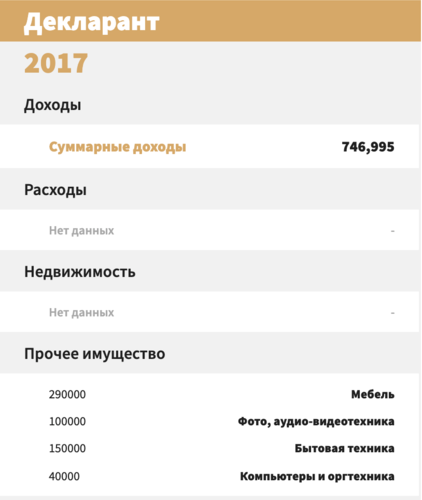 2016-жылы депутат үчүн бир аз жакшы жыл болгон. Декларациясына ылайык, ал 843,5 миң сом иштеп тапкан. Бирок анын мүлкү жок болгондуктан, дагы көрсөтүлгөн эмес.