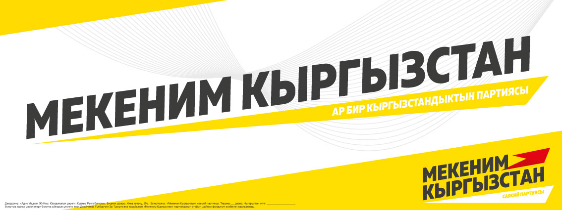 Буюртма каржы маселелери боюнча ыйгарым укуктуу өкүл Джайчиева Гулбарчин Эр Турсуновна тарабынан «Мекеним Кыргызстан» партиясынын атайын шайлоо фондунун эсебинен каржыланды. Юридикалык дареги: Кыргыз Республикасы, Бишкек шаары. Турусбеков көчөсү, 109/1. 510-кабинет.