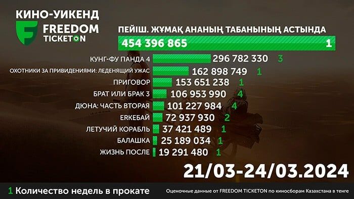 Режиссер Руслан Акундун «Бейиш — эненин таманында» аттуу тасмасы Казакстанда кассалык чогултуулар боюнча биринчи орунду ээледи. Маалымат коңшу өлкөнүн «Тикетон» билет сатуучу кызматынын сайтында жарыяланды.