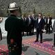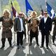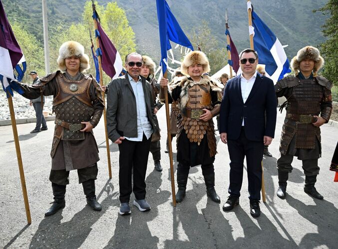 Өлкө лидерлерин төкмө акындар, «Алптар» баатырлары жана «Аталар изи» улуттук кийимчен кыздар тосуп алышты.