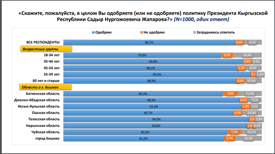 Калктын Садыр Жапаровго болгон ишеними 82,6 пайыздан 86,7 пайызга өстү. Бул мамлекет башчынын жана анын командасынын ишмердүүлүгүн кабыл алуудагы оң динамикадан кабар берет.