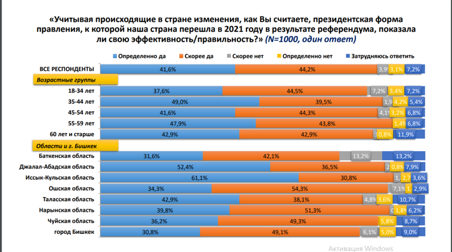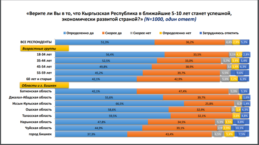 Сурамжылоого катышкандардын 87,5 пайызы жакынкы 5-10 жылда Кыргыз Республикасы ийгиликтүү, экономикалык жактан өнүккөн өлкөгө айланат деген ишенимин билдиришкен. Эң жогорку көрсөткүч — 89,9 пайызы негизинен 18-34 жаштагылар болгон.