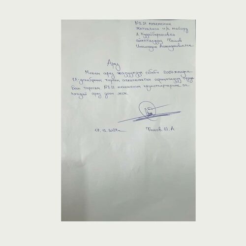 Имамидин Ташов Бакытбек Касымкуловдун катышуусунда ачкачылыкты токтотуу боюнча арыз жазды.
