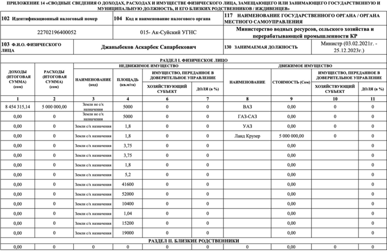 Айыл чарба министрлигинин мурдагы жетекчисинин бир нече унаалары бар — ВАЗ, ГАЗ-САЗ, УАЗ жана Toyota Land Cruiser, акыркысын 5 миллион сомго баалаган.