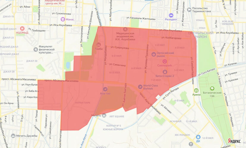 Ошондой эле төмөнкү көчөлөр менен чектелген аймакта Ч.Айтматов проспектиси — Абдрахманов көчөсү — Бакаев көчөсү — Масалиев проспектиси — Токтоналиев көчөсү — Ата-Түрк паркы — Ахунбаев көчөсү — Аламүдүн дарыясы — Түштүк чоң Чүй каналы — Б.Баатыр көчөсү — Ала-Арча дарыясы — Семетей көчөлөрүндө да өчүрүлөт.