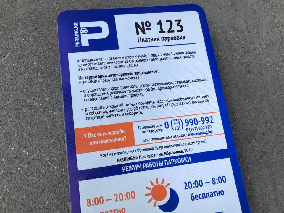 Унаа токтоочу жайда кароол болбойт. Андыктан, машина жана андагы буюмдардын коопсуздугуна эч ким жооп бербейт. Жекшемби жана майрам күндөрү унааны бекер токтотууга болот. Калган күндөрү 15 мүнөттөн ашык токтогон унаа акыны төлөйт.