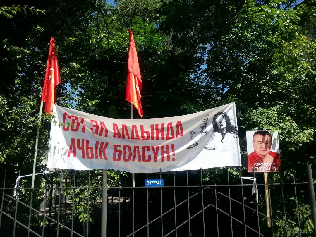 Бишкек шаарынын Биринчи май райондук сотунун алдында «Ата Мекен» партиясынын лидери Өмүрбек Текебаев, мурдакы министр Дүйшөн Чотоновду жана мурдакы депутат Райкан Төлөгөновду колдогон митинг өтүп жатат.