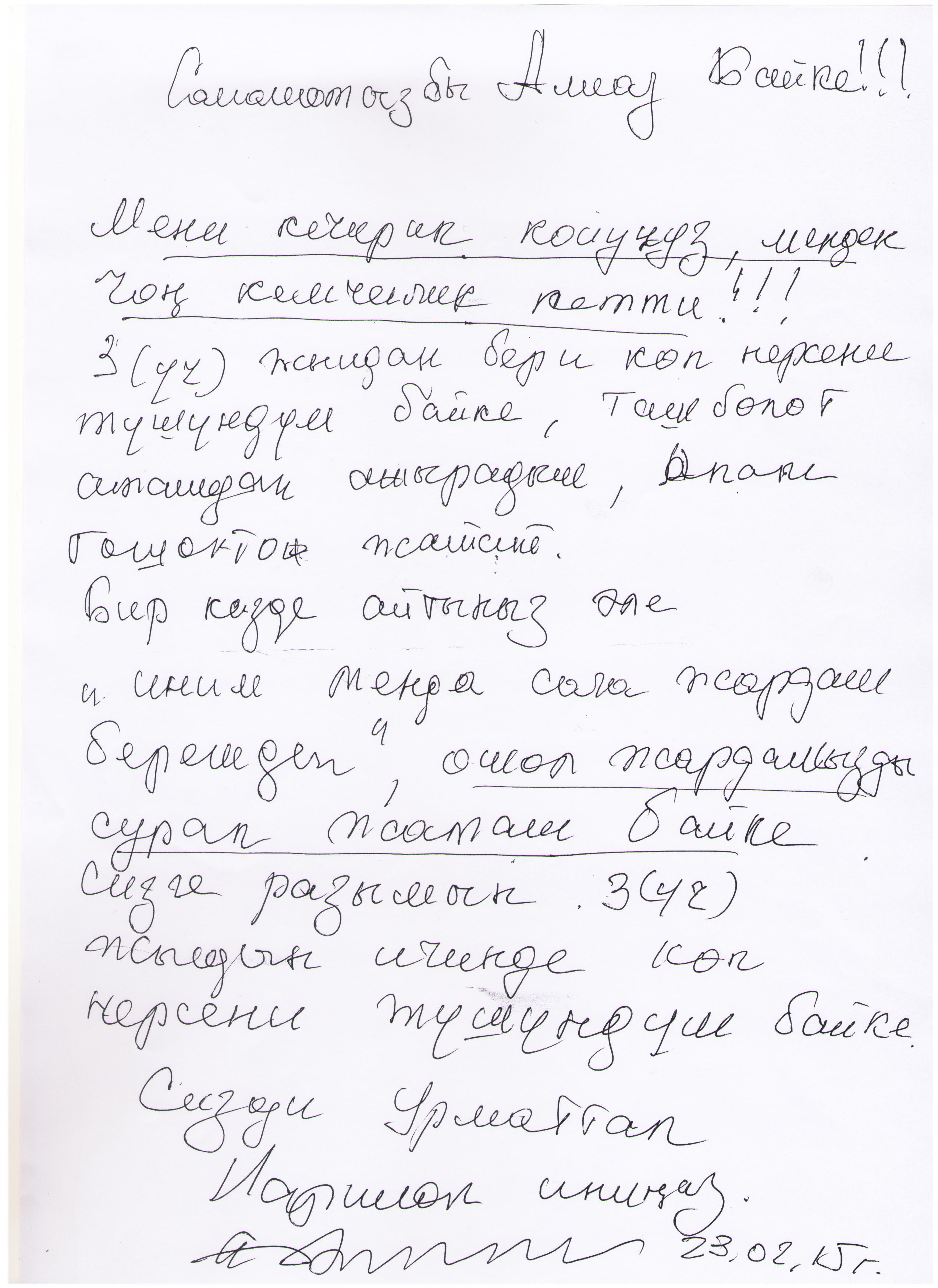 «Кечирип коюңуз. Менден чоң кемчилик кетти. Атамдан ажырадым, апам төшөктө жатат. Бир кезде жардам берериңизди айтыңыз эле, ошол жардамды күтүп жатам» — деп жазылат катта.