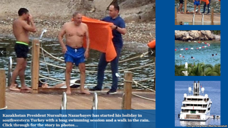 Нurriyet Daily News Нурсултан Назарбаев казак ишкери Алижан Ибрагимовдун яхтасына болуп, жак сакчылары менен сууда сүзүп, эс алуу аймагында сейилдеп басканын маалымдашат.