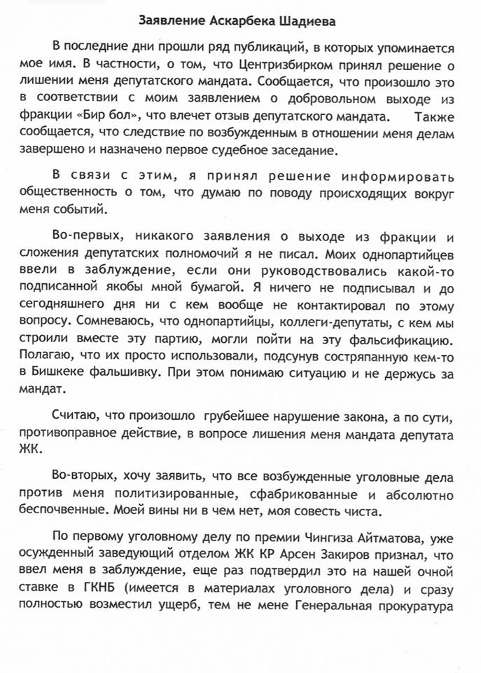 Спустя полгода после выезда из страны и объявления в розыск теперь уже бывший депутат Жогорку Кенеша Аскарбек Шадиев сделал заявление.