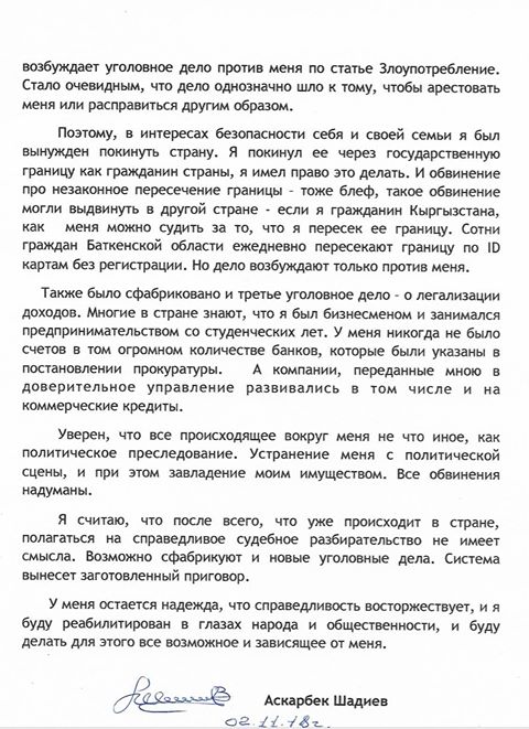 Аскарбек Шадиев добавил, что заявления о выходе из фракции «Бир Бор» не писал и ЦИК лишил его мандата незаконно. В Кыргызстан бывший депутат возвращаться не намерен. Он опасается за свою жизнь и жизнь семьи и не верит в торжество правосудия.