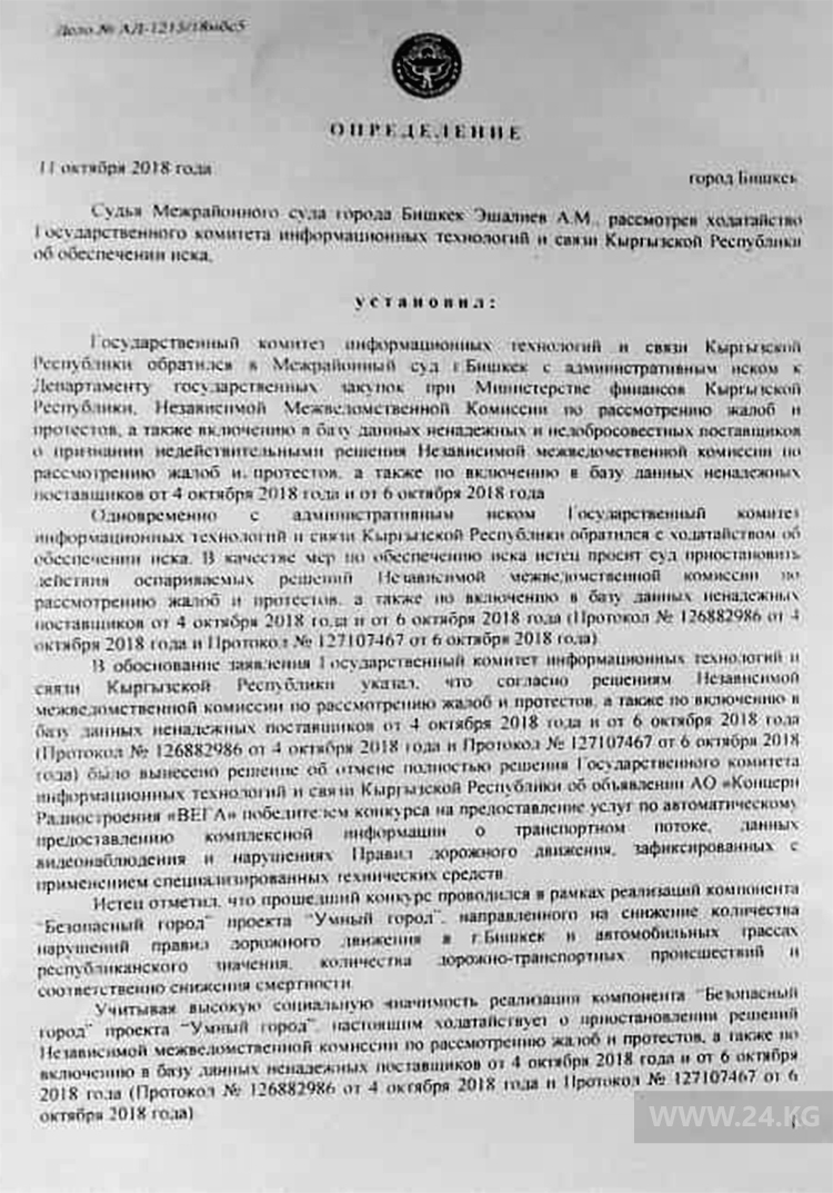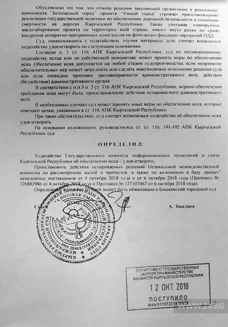 Определением межрайонного суда от 11 октября ходатайство об обеспечении иска удовлетворено и могло быть обжаловано в течение 10 дней в Бишкекском городском суде. Двенадцатого октября определение доставлено в общий отдел Департамента государственных закупок при Министерстве финансов КР.