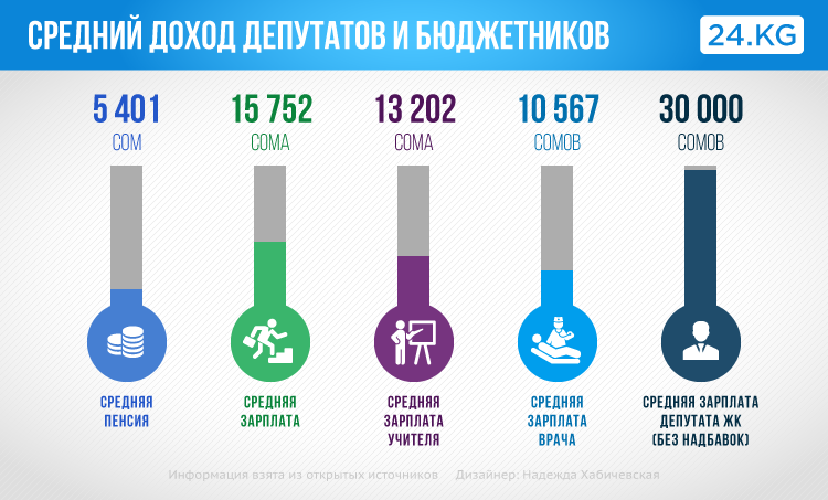 Депутатская зарплата без надбавок и привилегий — 30 тысяч сомов. Кстати, поблажек у народных избранников хоть отбавляй. К примеру, раз в году каждый из них получает 35 тысяч сомов на зимние заготовки — консервирование огурцов, помидоров и прочие варенья и соленья. Ежемесячно народный избранник от Жогорку Кенеша получает 40 тысяч сомов на текущие нужды.