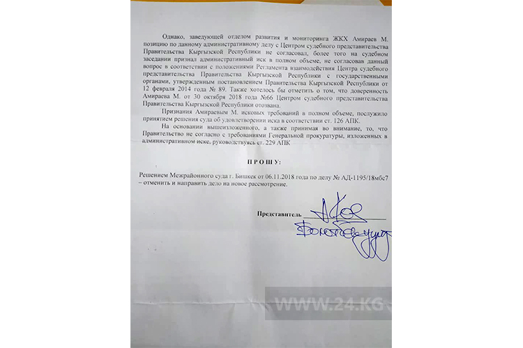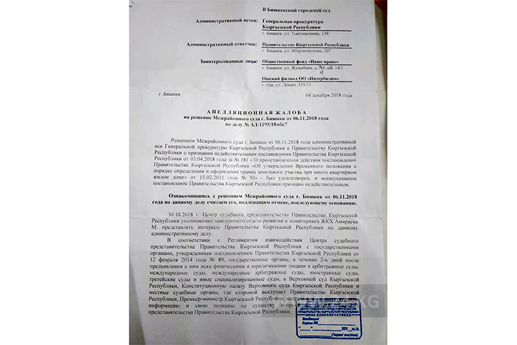 Правительство намерено обжаловать решение Межрайонного суда о признании недействительным постановления кабмина о запрете регистрации придомовых земельных участков (ПЗУ). Об этом 24-kg.com сообщила глава ОФ «Наше право» Калича Умуралиева.