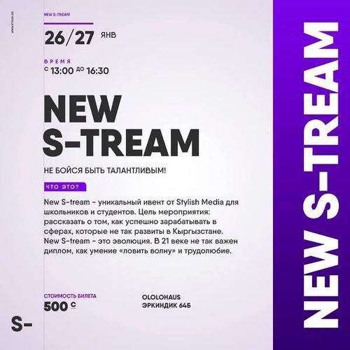 New s-tream — это уникальный ивент для школьников и студентов. Специалисты готовы поделиться навыками, как совмещать приятное с полезным для своего кошелька, но и как развивать технологии и культуру в Бишкеке. Цель мероприятия — показать, как творчество становится реальным заработком во взрослой жизни.