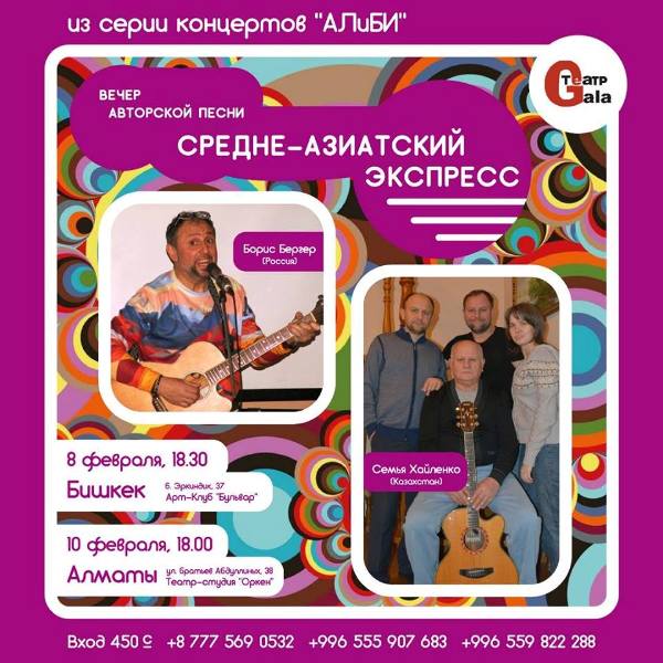 Замечательные авторы-исполнители Борис Бергер (Россия) и семья Хайленко (Казахстан) едут с концертом в Бишкек.