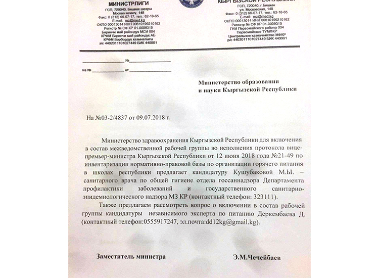 Данияр Деркембаев поднимает проблему школьного питания не первый год. Он обращался к вице-премьер-министру по социальным вопросам Алтынай Омурбековой. Своим письмом она рекомендовала Министерству здравоохранения включить повара в рабочую группу. Это поручение так и не исполнено.