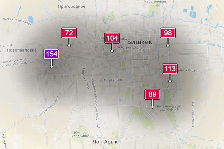 1. Жилмассив «Ак-Орго». Уровень загрязнения превышен в 4,2 раза: PM2.5 среднесуточный — 154 мкг/м³, на момент измерения — 148 мкг/м³.