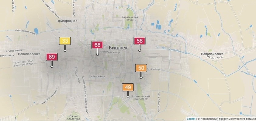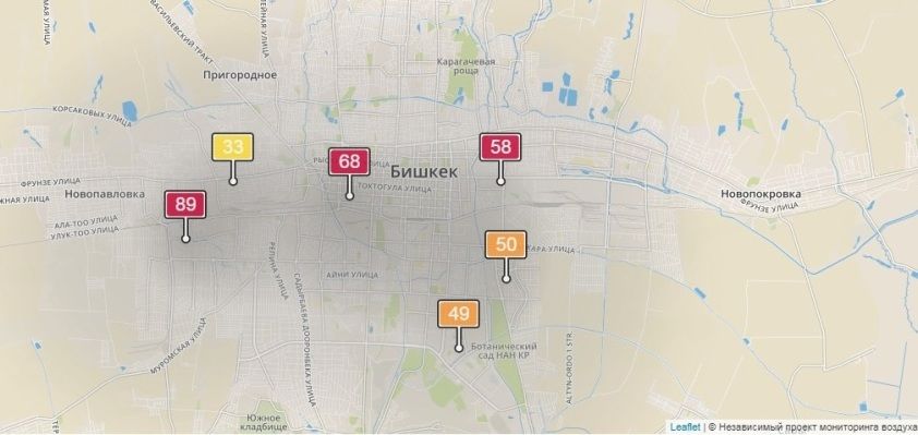 Общественное объединение MoveGreen и активист из Алматы Павел Александров собрали для Бишкека датчики и привязали их к карте.Для подсчета уровня загрязнения берут среднесуточные показатели. На карте также отмечен уровень загрязнения в режиме онлайн.