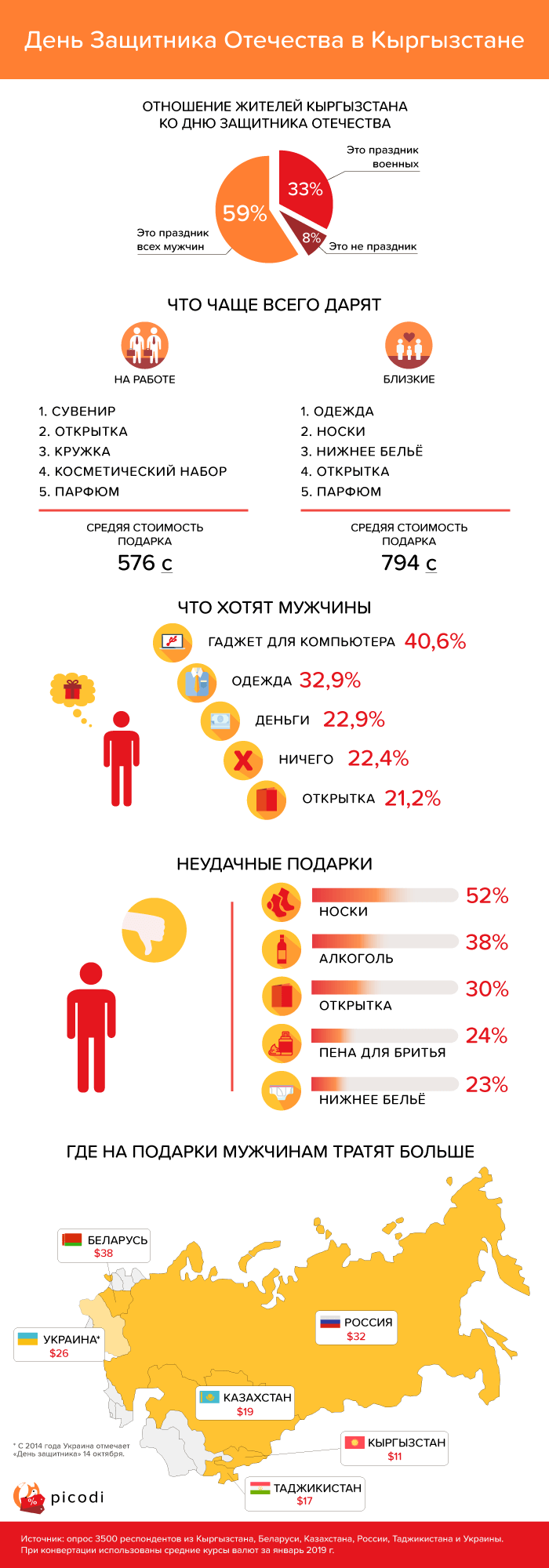 В преддверии Дня защитника Отечества Picodi.com провел опрос и узнал, какие подарки остаются актуальными и сколько на этот праздник планируют потратить респонденты из Кыргызстана, Таджикистана, Беларуси, России.
