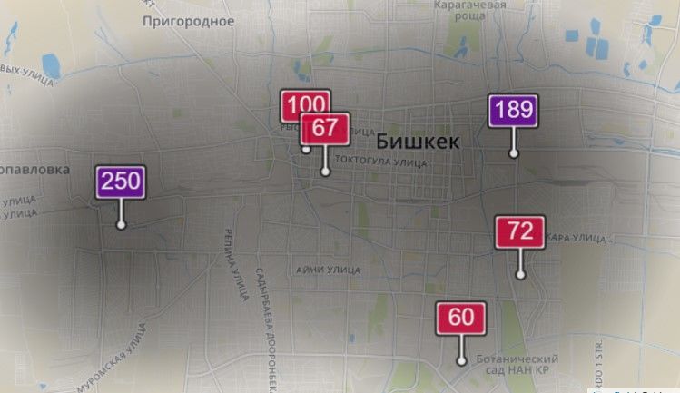 2. В районе улиц Бейшеналиевой/Токтогула. Уровень загрязнения превышен в 4,54 раза: PM2.5 среднесуточный — 159 мкг/м³, на момент измерения — 100 мкг/м³.