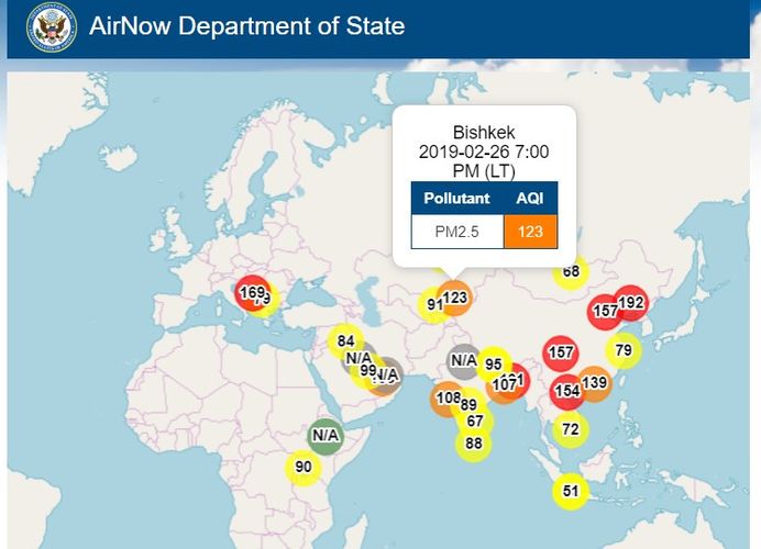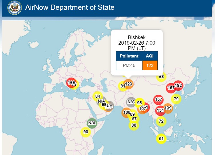 Посольство США в Кыргызстане также установило датчик, измеряющий уровень загрязнения воздуха. Информация обновляется ежечасно.