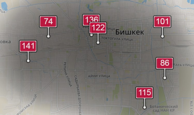 3. В районе улиц Бейшеналиевой/Токтогула. Уровень загрязнения превышен в 3,1 раза: PM2.5 среднесуточный — 109 мкг/м³, на момент измерения — 136 мкг/м³.