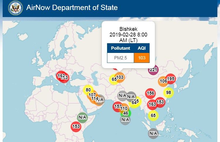 Посольство США в Кыргызстане также установило датчик, измеряющий уровень загрязнения воздуха. Информация обновляется ежечасно.