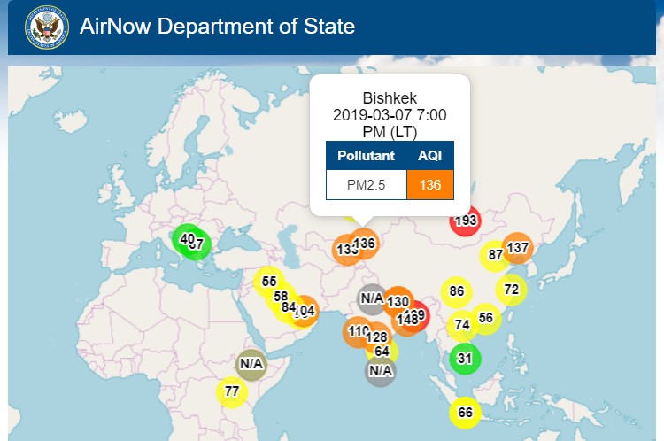 Посольство США в Кыргызстане также установило датчик, измеряющий уровень загрязнения воздуха. Информация обновляется ежечасно.