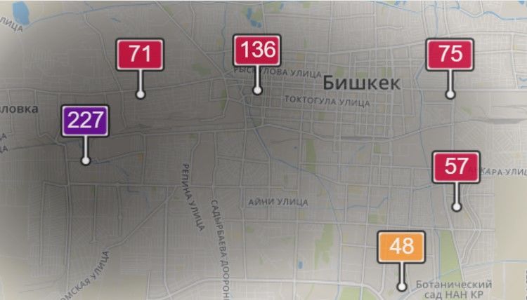 3. В районе улиц Бейшеналиевой/Токтогула. Уровень загрязнения превышен в 2,74 раза: PM2.5 среднесуточный — 96 мкг/м³, на момент измерения — 136 мкг/м³.