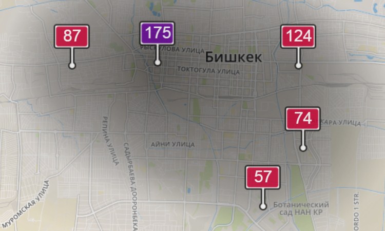 2. В районе улиц Бейшеналиевой/Токтогула. Уровень загрязнения превышен в 3,34 раза: PM2.5 среднесуточный — 117 мкг/м³, на момент измерения — 175 мкг/м³.