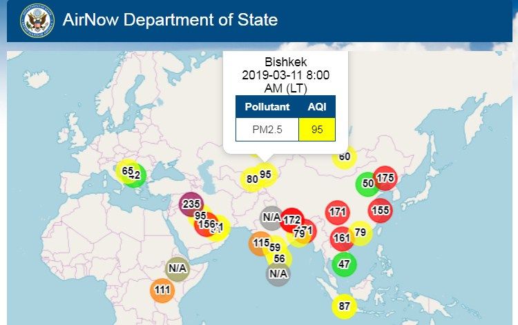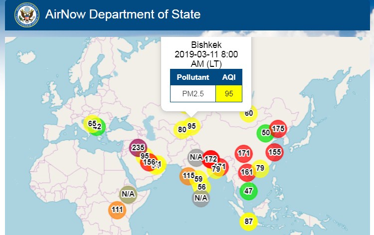 Посольство США в Кыргызстане также установило датчик, измеряющий уровень загрязнения воздуха. Информация обновляется ежечасно.