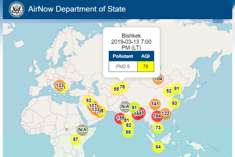 Посольство США в Кыргызстане также установило датчик, измеряющий уровень загрязнения воздуха. Информация обновляется ежечасно.